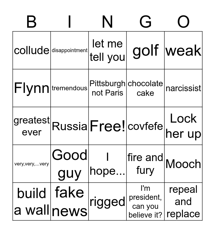 This bingo card has a free space and 24 words: Good guy, fake news, Pittsburgh not Paris, build a wall, weak, collude, Flynn, disappointment, covfefe, I hope..., chocolate cake, greatest ever, fire and fury, Mooch, tremendous, I'm president, can you believe it?, Lock her up, let me tell you, narcissist, Russia, repeal and replace, very,very,...very, golf and rigged.
