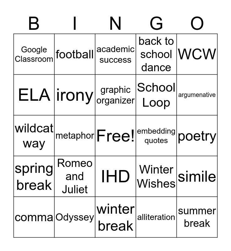 This bingo card has a free space and 24 words: Romeo and Juliet, Odyssey, graphic organizer, comma, WCW, Google Classroom, ELA, football, embedding quotes, IHD, School Loop, wildcat way, Winter Wishes, simile, irony, alliteration, poetry, academic success, argumenative, metaphor, summer break, spring break, back to school dance and winter break.