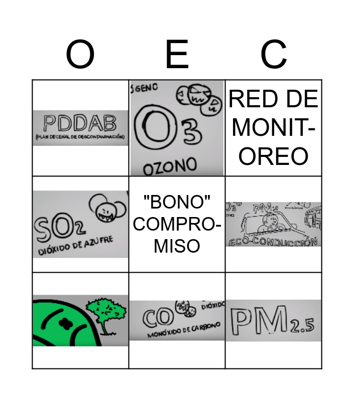 This bingo card has 7 images, a free space and 1 words: RED DE MONIT- OREO.