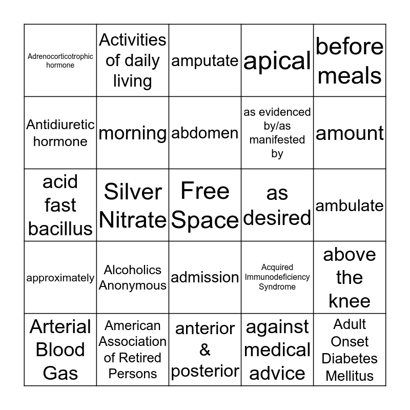 This bingo card has a free space and 24 words: Alcoholics Anonymous, American Association of Retired Persons, abdomen, Arterial Blood Gas, before meals, Adrenocorticotrophic hormone, Antidiuretic hormone, Activities of daily living, as desired, admission, as evidenced by/as manifested by, acid fast bacillus, Acquired Immunodeficiency Syndrome, above the knee, morning, against medical advice, ambulate, amputate, amount, Silver Nitrate, Adult Onset Diabetes Mellitus, approximately, apical and anterior & posterior.