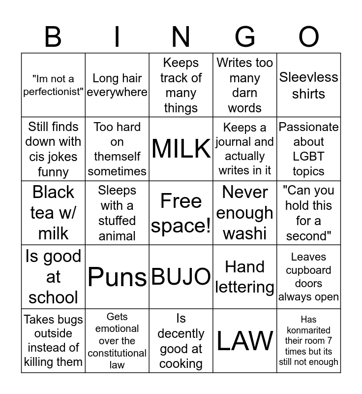 This bingo card has a free space and 24 words: Puns, Gets emotional over the constitutional law, MILK, Takes bugs outside instead of killing them, Sleevless shirts, "Im not a perfectionist", Still finds down with cis jokes funny, Long hair everywhere, Never enough washi, BUJO, Keeps a journal and actually writes in it, Black tea w/ milk, Hand lettering, Leaves cupboard doors always open, Too hard on themself sometimes, LAW, "Can you hold this for a second", Keeps track of many things, Passionate about LGBT topics, Sleeps with a stuffed animal, Has konmarited their room 7 times but its still not enough, Is good at school, Writes too many darn words and Is decently good at cooking.