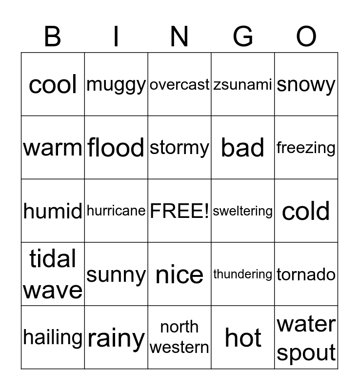 This bingo card has a free space and 24 words: sunny, rainy, stormy, hailing, snowy, cool, warm, muggy, sweltering, nice, bad, humid, thundering, tornado, flood, hot, cold, overcast, freezing, hurricane, water spout, tidal wave, zsunami and north western.