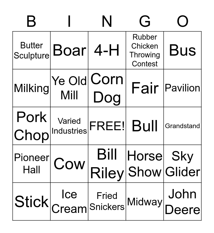 This bingo card has a free space and 24 words: Cow, Ice Cream, Corn Dog, Stick, Bus, Butter Sculpture, Milking, Boar, Bull, Bill Riley, Fair, Pork Chop, Horse Show, Sky Glider, Ye Old Mill, Midway, Grandstand, 4-H, Pavilion, Varied Industries, John Deere, Pioneer Hall, Rubber Chicken Throwing Contest and Fried Snickers.