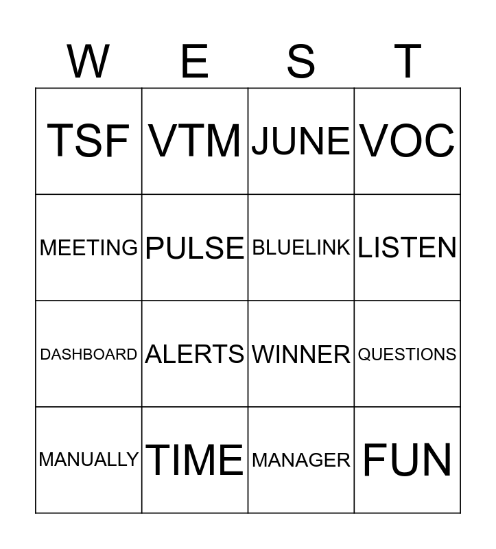This bingo card has 16 words: MANUALLY, TIME, JUNE, VOC, MEETING, VTM, WINNER, QUESTIONS, TSF, PULSE, MANAGER, LISTEN, DASHBOARD, ALERTS, BLUELINK and FUN.