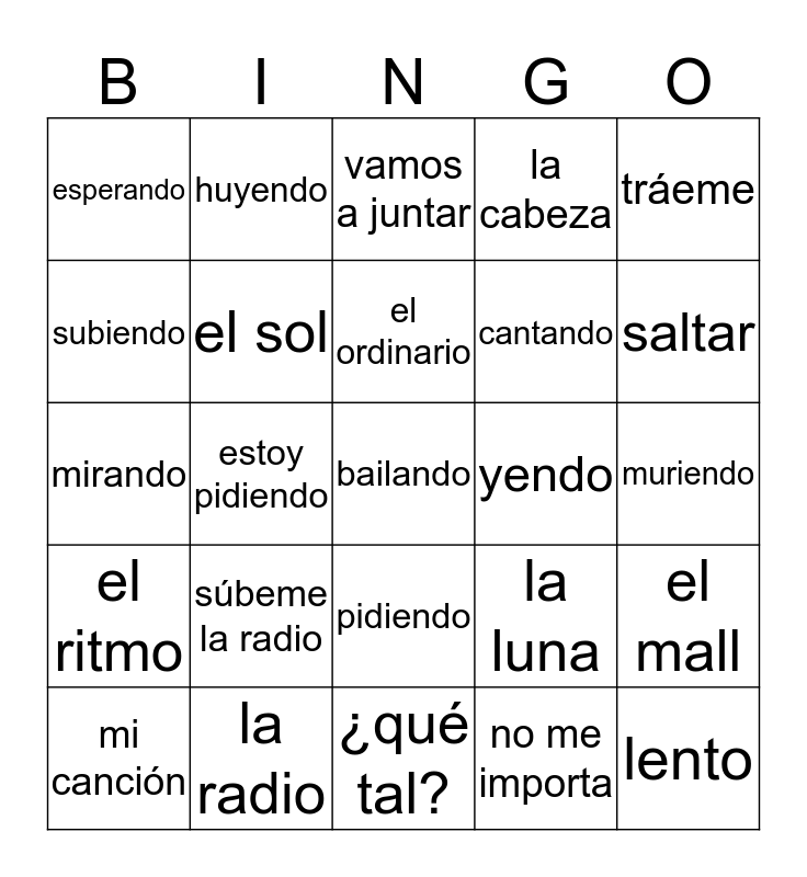This bingo card has a free space and 24 words: súbeme la radio, la radio, el ordinario, mi canción, tráeme, esperando, subiendo, huyendo, yendo, pidiendo, cantando, mirando, la luna, el mall, el sol, no me importa, muriendo, vamos a juntar, saltar, estoy pidiendo, lento, el ritmo, la cabeza and ¿qué tal?.