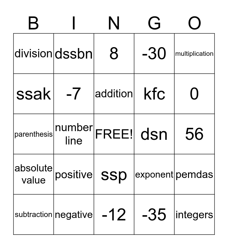 This bingo card has a free space and 24 words: positive, negative, addition, subtraction, multiplication, division, ssak, dssbn, dsn, ssp, kfc, parenthesis, exponent, pemdas, -7, -35, 56, 8, 0, number line, integers, absolute value, -30 and -12.