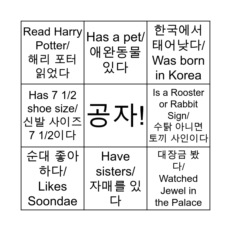 This bingo card has a free space and 8 words: Is a Rooster or Rabbit Sign/ 수탉 아니면 토끼 사인이다, 한국에서 태어낮다/ Was born in Korea, Has a pet/ 애완동물 있다, 순대 좋아하다/ Likes Soondae, Read Harry Potter/ 해리 포터 읽었다, 대장금 봤다/ Watched Jewel in the Palace, Has 7 1/2 shoe size/ 신발 사이즈 7 1/2이다 and Have sisters/ 자매를 있다.
