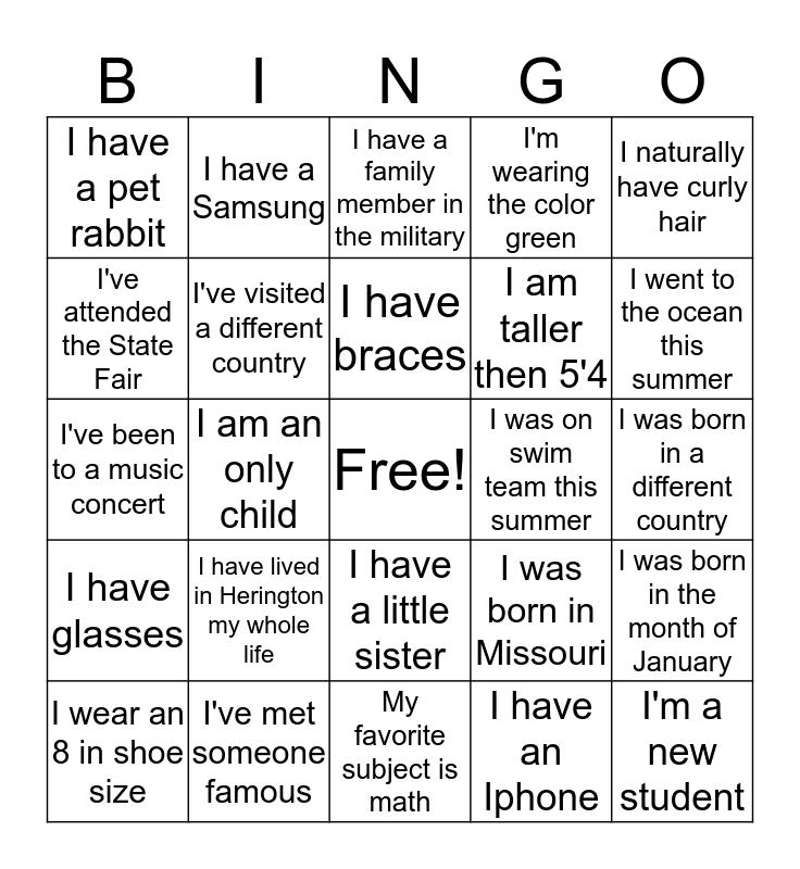 This bingo card has a free space and 24 words: I have lived in Herington my whole life, I've met someone famous, I have braces, I wear an 8 in shoe size, I naturally have curly hair, I have a pet rabbit, I've attended the State Fair, I have a Samsung, I was on swim team this summer, I have a little sister, I am taller then 5'4, I've been to a music concert, I was born in Missouri, I was born in the month of January, I've visited a different country, I have an Iphone, I was born in a different country, I have a family member in the military, I went to the ocean this summer, I am an only child, I'm a new student, I have glasses, I'm wearing the color green and My favorite subject is math.