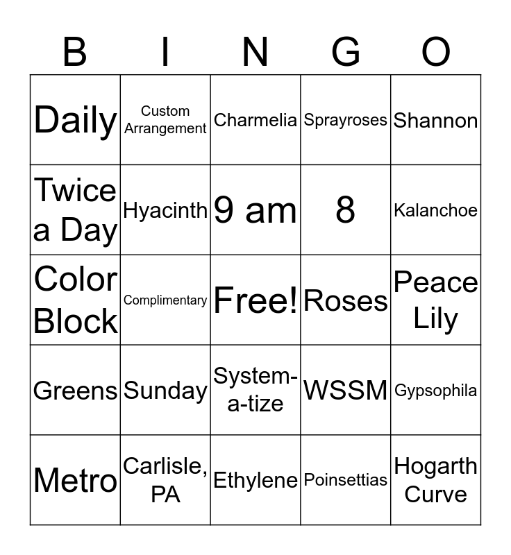 This bingo card has a free space and 24 words: Sunday, Carlisle, PA, 9 am, Metro, Shannon, Daily, Twice a Day, Custom Arrangement, Roses, System-a-tize, 8, Color Block, WSSM, Gypsophila, Hyacinth, Poinsettias, Peace Lily, Charmelia, Kalanchoe, Complimentary, Hogarth Curve, Greens, Sprayroses and Ethylene.