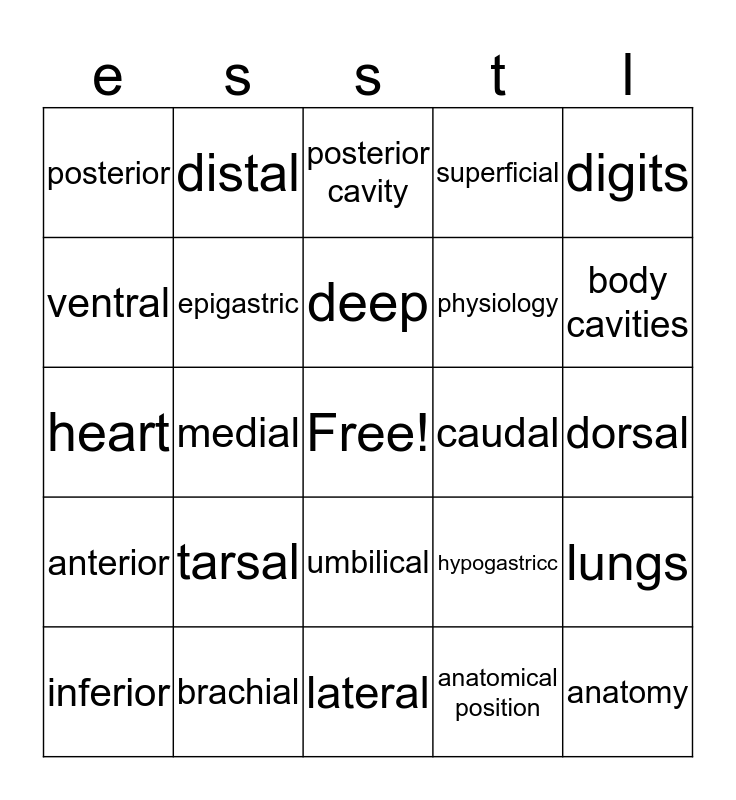 This bingo card has a free space and 24 words: tarsal, brachial, deep, inferior, digits, posterior, ventral, distal, caudal, umbilical, physiology, heart, hypogastricc, lungs, epigastric, anatomical position, dorsal, posterior cavity, body cavities, medial, anatomy, anterior, superficial and lateral.