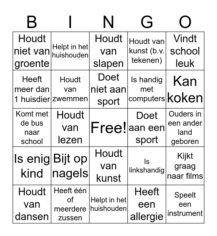 This bingo card has a free space and 24 words: Bijt op nagels, Heeft één of meerdere zussen, Doet niet aan sport, Houdt van dansen, Vindt school leuk, Houdt niet van groente, Heeft meer dan 1 huisdier, Helpt in het huishouden, Doet aan een sport, Houdt van kunst, Is handig met computers, Komt met de bus naar school, Is linkshandig, Kijkt graag naar films, Houdt van zwemmen, Heeft een allergie, Ouders in een ander land geboren, Houdt van slapen, Kan koken, Houdt van lezen, Speelt een instrument, Is enig kind, Houdt van kunst (b.v. tekenen) and Helpt in het huishouden.
