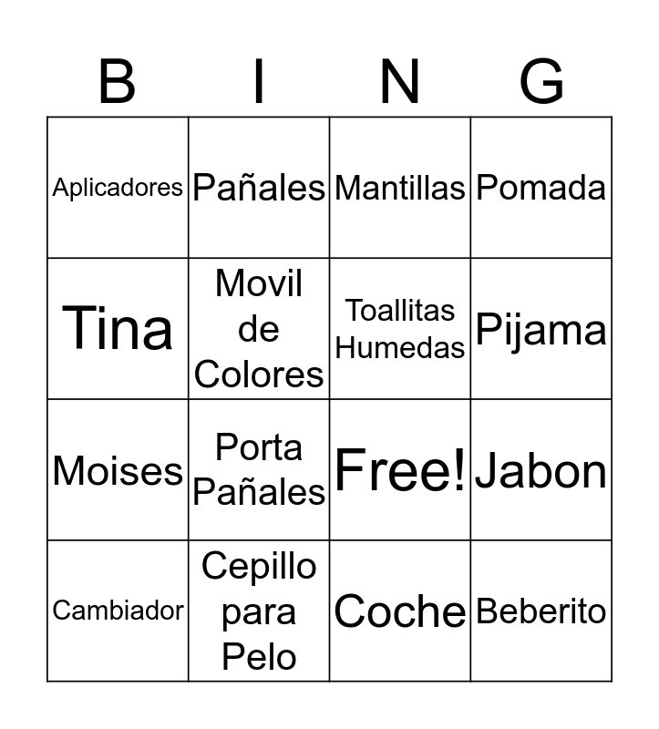 This bingo card has 19 words: Free!, Chupon, Mantillas, Beberito, Jabon, Tina, Coche, Aplicadores, Pañales, Moises, Porta Pañales, Movil de Colores, Toallitas Humedas, Cepillo para Pelo, Cambiador, Termometro, Pomada, Pijama and Sonajero.