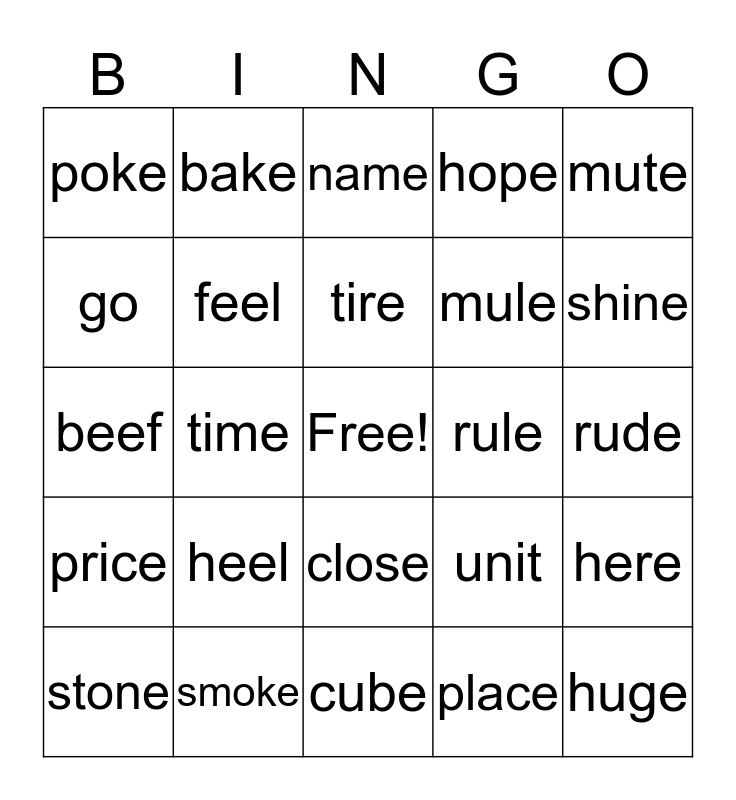 This bingo card has a free space and 54 words: smile, price, bone, joke, close, home, hope, zone, go, so, poke, vote, smoke, stone, use, cube, huge, mule, flute, rude, unit, tube, rule, mute, tune, bake, base, drape, cake, place, whale, plate, hate, late, name, grape, beef, here, feed, feel, queen, green, cheek, sleep, heel, fire, life, wife, tire, time, shine, rice, pride and pipe.