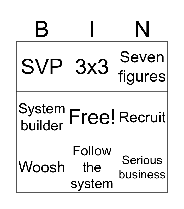 This bingo card has a free space and 8 words: Recruit, Seven figures, 3x3, Woosh, SVP, Serious business, System builder and Follow the system.