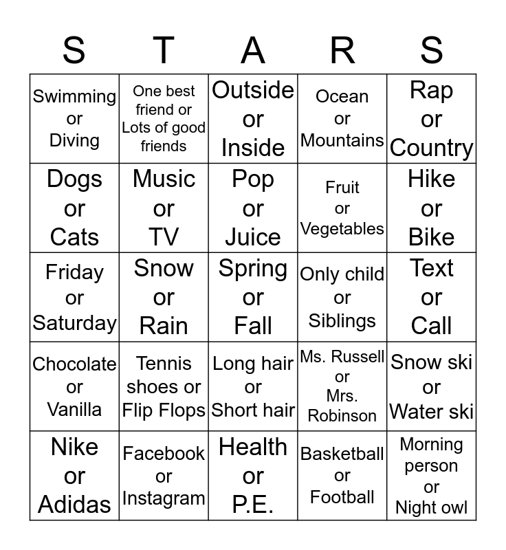 This bingo card has 25 words: Tennis shoes or Flip Flops, Health or P.E., Pop or Juice, Nike or Adidas, Rap or Country, Swimming or Diving, Dogs or Cats, One best friend or Lots of good friends, Only child or Siblings, Long hair or Short hair, Fruit or Vegetables, Friday or Saturday, Ms. Russell or Mrs. Robinson, Snow ski or Water ski, Music or TV, Morning person or Night owl, Text or Call, Outside or Inside, Hike or Bike, Snow or Rain, Spring or Fall, Facebook or Instagram, Chocolate or Vanilla, Ocean or Mountains and Basketball or Football.