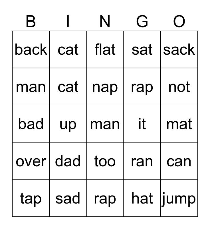 This bingo card has a free space and 24 words: dad, sad, nap, tap, sack, back, man, cat, it, too, rap, bad, ran, can, cat, hat, mat, flat, not, up, jump, over, sat and rap.