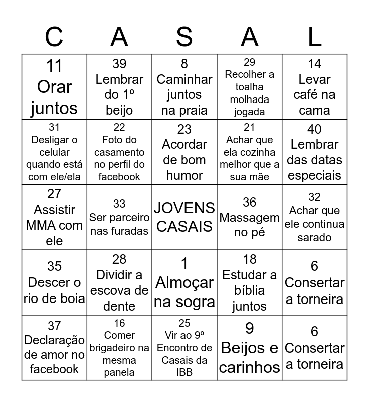 This bingo card has a free space and 39 words: 4 Quilos extras e gordurinhas a mais, 19 Gargalhar de alegria, 20 Ver o por do sol abraçadoscompras no shopping, 18 Estudar a bíblia juntos, 6 Consertar a torneira, 35 Descer o rio de boia, 33 Ser parceiro nas furadas, 2 Dormir de conchinha, 36 Massagem no pé, 32 Achar que ele continua sarado, 31 Desligar o celular quando está com ele/ela, 39 Lembrar do 1º beijo, 17 Viver juntos para sempre, 40 Lembrar das datas especiais, 27 Assistir MMA com ele, 28 Dividir a escova de dente, 1 Almoçar na sogra, 29 Recolher a toalha molhada jogada, 30 Esperar com paciência enquanto ela faz compras no shopping, 37 Declaração de amor no facebook, 22 Foto do casamento no perfil do facebook, 23 Acordar de bom humor, 9 Beijos e carinhos, 14 Levar café na cama, 5 Dizer que ela é linda quando acorda, 16 Comer brigadeiro na mesma panela, 25 Vir ao 9º Encontro de Casais da IBB, 15 Não se irritar com a tpm dela, 3 Assistir comédias românticas com ela, 11 Orar juntos, 26 INCENTIVO sempre!, 7 Dar presentes, 21 Achar que ela cozinha melhor que a sua mãe, 6 Consertar a torneira, 24 Recados de amor na geladeira, 34 Discutir a relação com alegria, 8 Caminhar juntos na praia, 12 Dividir o yakult and 38 Tirar várias selfies juntos.