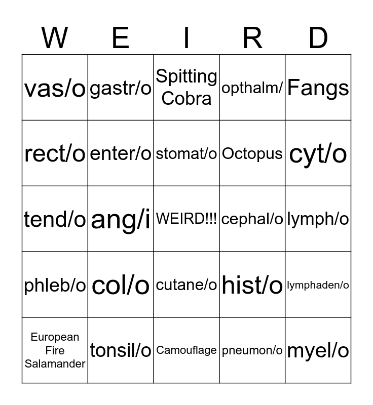 This bingo card has a free space and 92 words: Predators, Spiny Devil Katydid, Camouflage, Chameleon, Weedy Sea Dragon, Leafy Sea Dragon, Leaf Insect, European Fire Salamander, Bright Colors, Lionfish, Poison Dart Frog, Horned Lizard, Canine Repellent Chemicals, Octopus, Venom, Fangs, Spitting Cobra, Disguise, Stargazer fish, Anglerfish, Crab Spider, Long-eared Owl, Frilled Lizard, Porcupine fish, col/o, enter/o, viscer/o, cili/o, pil/o, derm/o, tonsil/o, cutane/o, onych/o, esophag/o, gastr/o, lingu/o, hepat/o, or/o, stomat/o, hist/o, tend/o, phleb/o, lymph/o, ureter/o, myel/o, oophor/o, vulv/o, rhin/o, ren/o, nephr/o, neur/o, aden/o, salping/o, blephar/o, colp/o, orchid/o, pharyng/o, rect/o, cyst/o, ang/i, vas/o, arteri/o, axill/o, thorac/o, chondr/o, pneumon/o, my/o, gynec/o, mast/o, bronch/o, laryng/o, hyster/o, opthalm/, oot/o, hemat/o, ven/o, lymphaden/o, prostat/o, phren/o, bi/o, lip/o, cephal/o, vas/o, cardi/o, lymphangio/o, cerebr/o, encephal/o, splen/o, cervic/o, an/o, cyt/o and cheil/o.