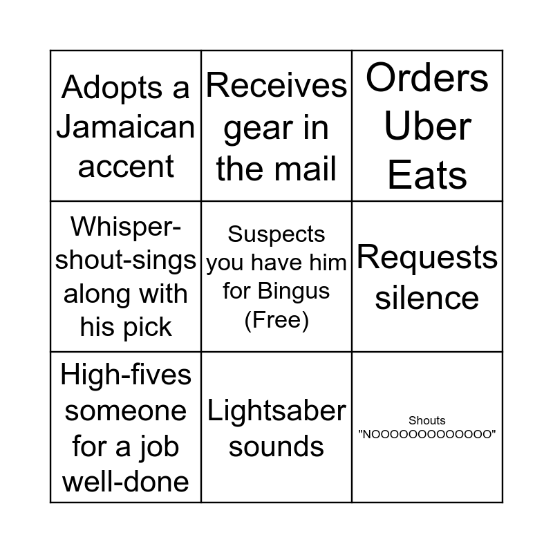 This bingo card has a free space and 8 words: Requests silence, Orders Uber Eats, Receives gear in the mail, High-fives someone for a job well-done, Adopts a Jamaican accent, Shouts "NOOOOOOOOOOOOO", Whisper-shout-sings along with his pick and Lightsaber sounds.