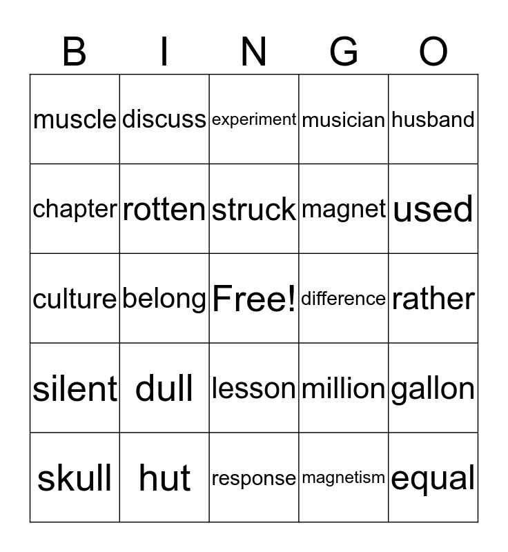 This bingo card has a free space and 24 words: dull, hut, struck, skull, husband, muscle, chapter, discuss, difference, lesson, magnet, culture, million, gallon, rotten, magnetism, rather, experiment, used, belong, equal, silent, musician and response.