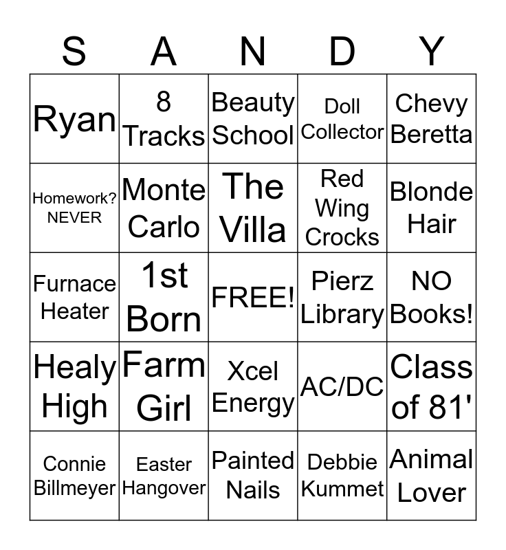 This bingo card has a free space and 31 words: Painted Nails, NASCAR, 1st Born, Purses, Ryan, Beauty School, Monte Carlo, AC/DC, Pierz Library, Debbie Kummet, NO Books!, Animal Lover, Antiquing, Freeze Baby, Blonde Hair, Florida, Class of 81', Farm Girl, Healy High, Xcel Energy, Chevy Beretta, Those "J" Things, Connie Billmeyer, 8 Tracks, Red Wing Crocks, Homework? NEVER, Doll Collector, Furnace Heater, Easter Hangover, The Villa and Lastrup Lakers Softball.