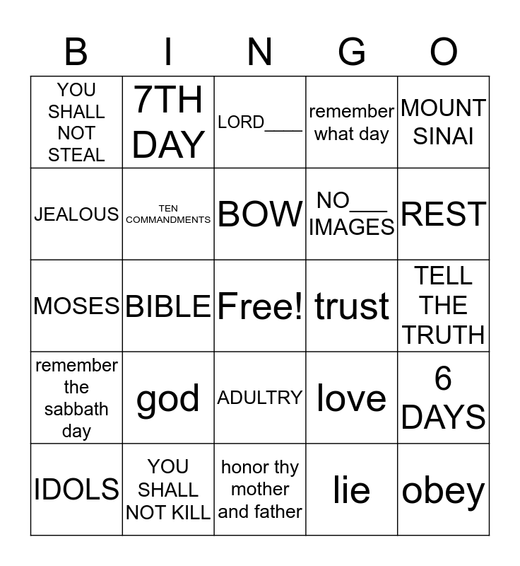 This bingo card has a free space and 24 words: god, YOU SHALL NOT KILL, BOW, IDOLS, MOUNT SINAI, YOU SHALL NOT STEAL, JEALOUS, 7TH DAY, trust, ADULTRY, NO___ IMAGES, MOSES, love, 6 DAYS, TEN COMMANDMENTS, lie, TELL THE TRUTH, LORD____, REST, BIBLE, obey, remember the sabbath day, remember what day and honor thy mother and father.