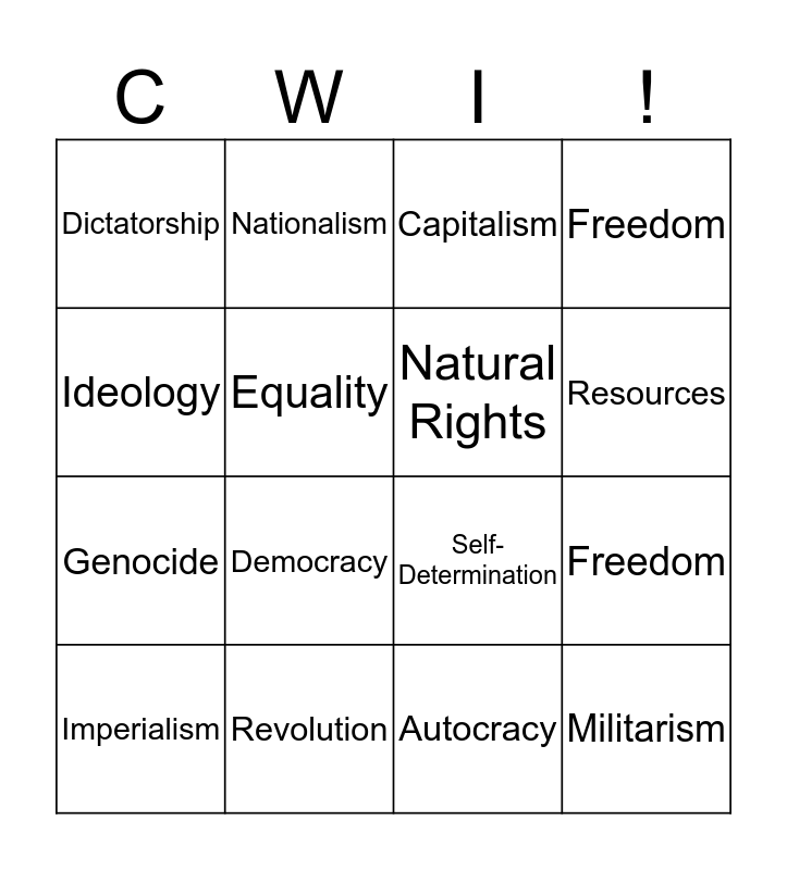 This bingo card has 16 words: Revolution, Freedom, Capitalism, Dictatorship, Genocide, Nationalism, Self-Determination, Autocracy, Ideology, Equality, Imperialism, Freedom, Democracy, Resources, Natural Rights and Militarism.