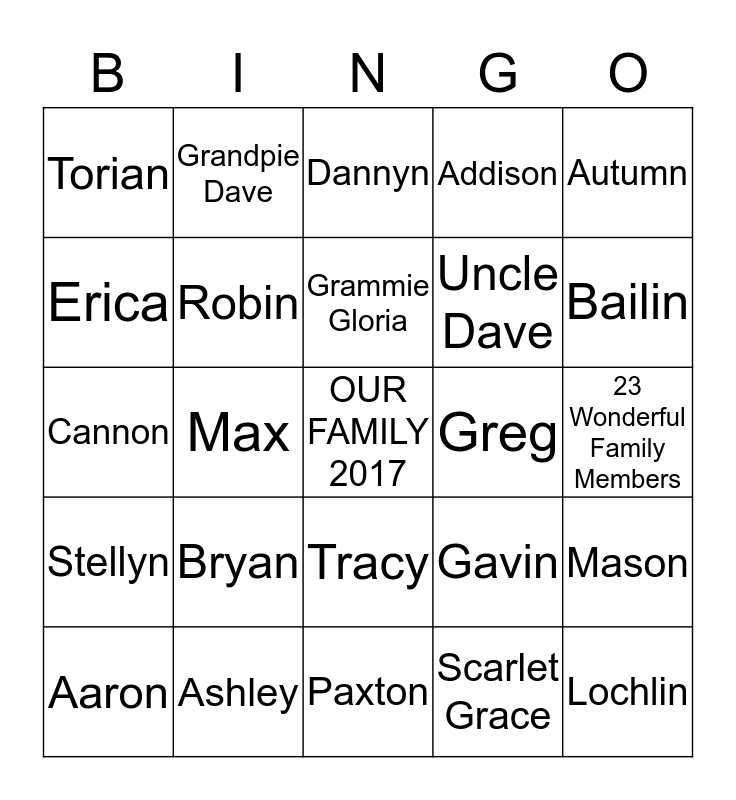 This bingo card has a free space and 24 words: Bryan, Ashley, Grammie Gloria, Aaron, Autumn, Torian, Erica, Grandpie Dave, Greg, Tracy, Uncle Dave, Cannon, Gavin, Mason, Robin, Scarlet Grace, 23 Wonderful Family Members, Dannyn, Bailin, Max, Lochlin, Stellyn, Addison and Paxton.