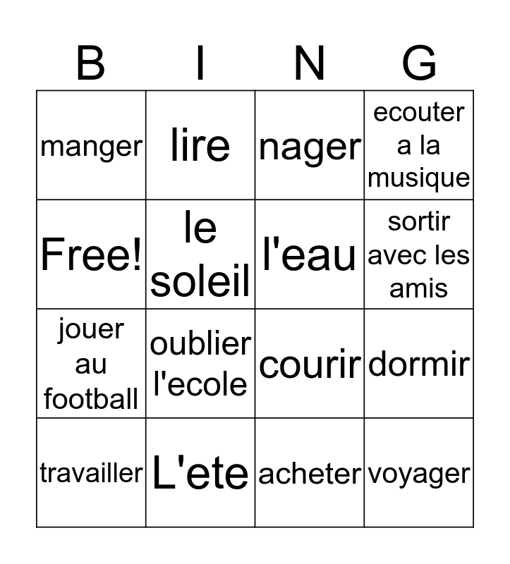 This bingo card has 16 words: L'ete, dormir, nager, manger, jouer au football, lire, courir, acheter, Free!, le soleil, travailler, ecouter a la musique, oublier l'ecole, sortir avec les amis, l'eau and voyager.