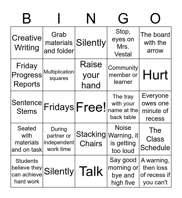 This bingo card has a free space and 24 words: During partner or independent work time, Silently, Raise your hand, Students believe they can achieve hard work, The board with the arrow, Creative Writing, Friday Progress Reports, Grab materials and folder, The tray with your name at the back table, Stacking Chairs, Community member or learner, Sentence Stems, Noise Warning, it is getting too loud, The Class Schedule, Multiplication squares, Say good morning or bye and high five, Everyone owes one minute of recess, Silently, Hurt, Fridays, A warning, then loss of recess if you can't, Seated with materials and on task, Stop, eyes on Mrs. Vestal and Talk.