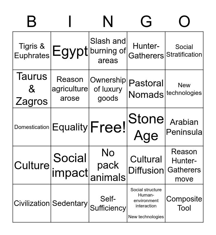 This bingo card has a free space and 24 words: Social impact, Sedentary, Ownership of luxury goods, Civilization, Social Stratification, Tigris & Euphrates, Taurus & Zagros, Egypt, Stone Age, No pack animals, Pastoral Nomads, Domestication, Cultural Diffusion, Reason Hunter-Gatherers move, Reason agriculture arose, Social structure Human-environment interaction New technologies, Arabian Peninsula, Slash and burning of areas, New technologies, Equality, Composite Tool, Culture, Hunter-Gatherers and Self-Sufficiency.