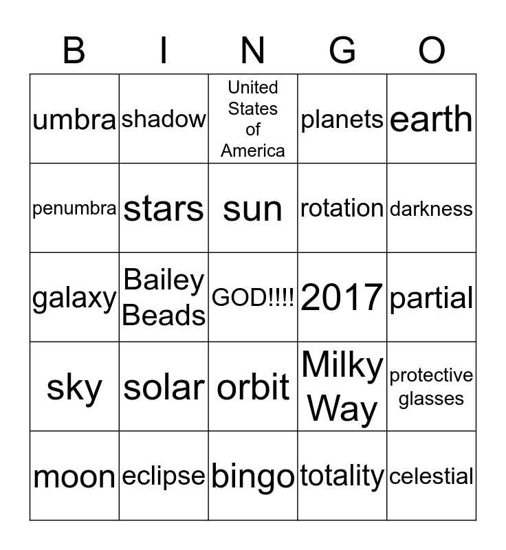 This bingo card has a free space and 24 words: solar, eclipse, sun, moon, earth, umbra, penumbra, shadow, 2017, orbit, rotation, galaxy, Milky Way, protective glasses, stars, totality, partial, United States of America, darkness, Bailey Beads, celestial, sky, planets and bingo.