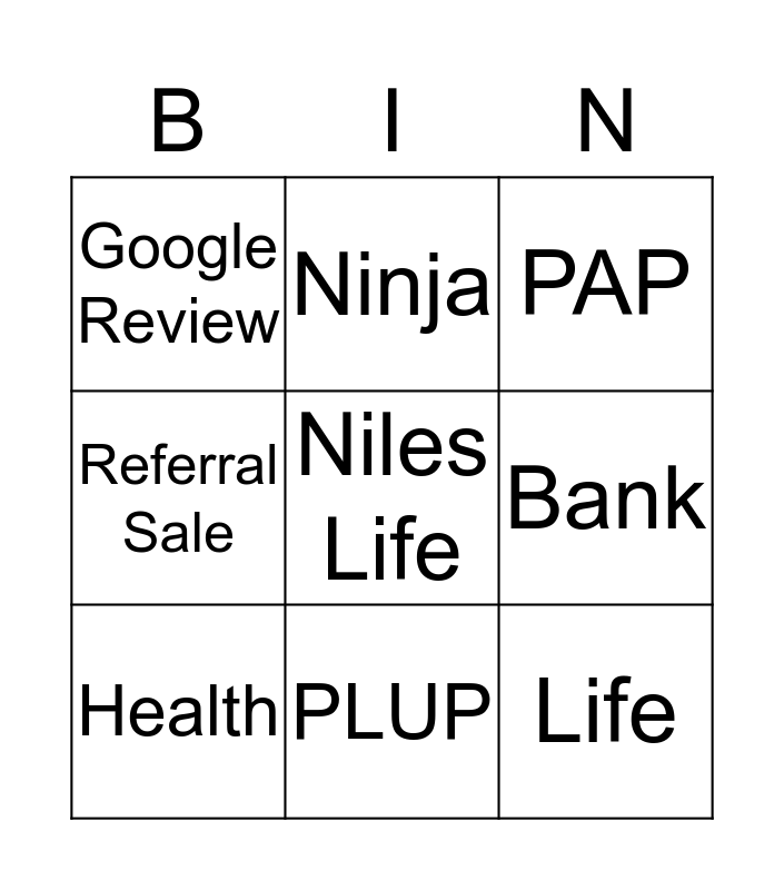 This bingo card has 9 words: Health, PAP, Ninja, Referral Sale, Google Review, Bank, Niles Life, Life and PLUP.