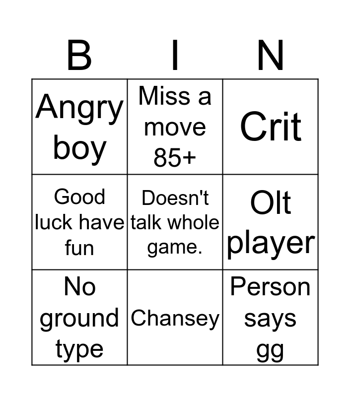 This bingo card has a free space and 8 words: Olt player, Crit, Miss a move 85+, No ground type, Angry boy, Person says gg, Good luck have fun and Chansey.