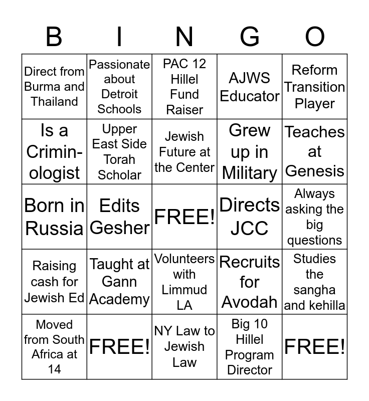 This bingo card has a free space and 24 words: Taught at Gann Academy, FREE!, Jewish Future at the Center, Moved from South Africa at 14, Reform Transition Player, Direct from Burma and Thailand, Is a Crimin-ologist, Passionate about Detroit Schools, Directs JCC, Volunteers with Limmud LA, Grew up in Military, Born in Russia, Recruits for Avodah, Studies the sangha and kehilla, Upper East Side Torah Scholar, Big 10 Hillel Program Director, Always asking the big questions, PAC 12 Hillel Fund Raiser, Teaches at Genesis, Edits Gesher, FREE!, Raising cash for Jewish Ed, AJWS Educator and NY Law to Jewish Law.