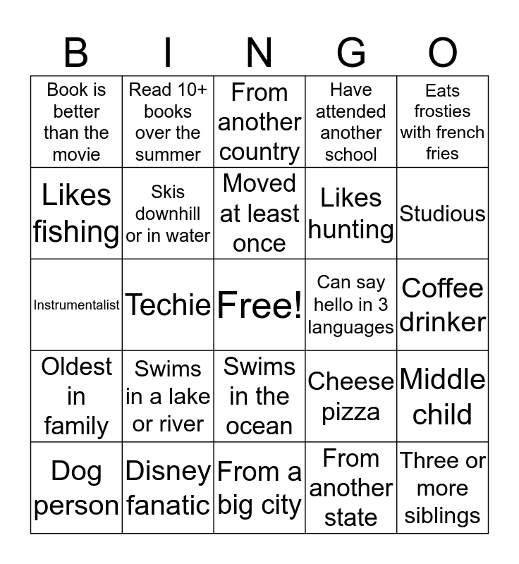 This bingo card has a free space and 43 words: Only one sibling, Three or more siblings, Cat person, Dog person, Pet reptile, From another state, From another country, Have visited an island, Eats frosties with french fries, Disney fanatic, Have attended another school, Can say hello in 3 languages, Swims in the ocean, Swims in a lake or river, From the country, From a big city, Artist, Instrumentalist, Athletic, Studious, Read 10+ books over the summer, Saw the movie Cars 3, Read all of Harry Potter, Book is better than the movie, Movie is better than the book, Coffee drinker, Tea drinker, Supreme pizza, Cheese pizza, Oldest in family, Youngest in family, Middle child, Vocalist, Techie, Does Bible Quizzing, Summer Road Trip, Lots of cousins, Moved at least once, Likes fishing, Likes hunting, Goes camping, Skis downhill or in water and Grows a garden.