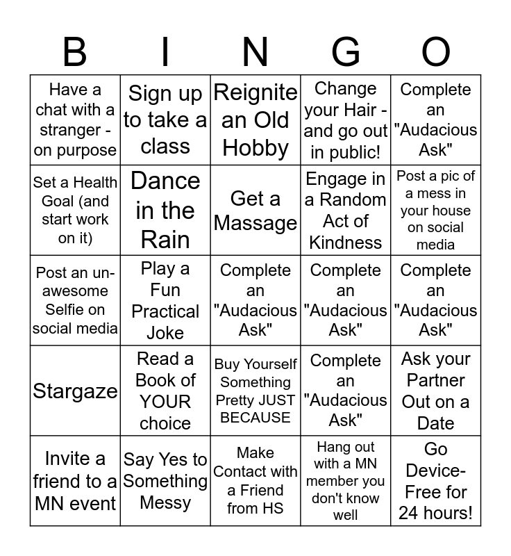 This bingo card has 25 words: Read a Book of YOUR choice, Make Contact with a Friend from HS, Get a Massage, Invite a friend to a MN event, Complete an "Audacious Ask", Have a chat with a stranger - on purpose, Set a Health Goal (and start work on it), Sign up to take a class, Complete an "Audacious Ask", Buy Yourself Something Pretty JUST BECAUSE, Engage in a Random Act of Kindness, Post an un-awesome Selfie on social media, Complete an "Audacious Ask", Ask your Partner Out on a Date, Dance in the Rain, Go Device-Free for 24 hours!, Complete an "Audacious Ask", Reignite an Old Hobby, Post a pic of a mess in your house on social media, Play a Fun Practical Joke, Complete an "Audacious Ask", Say Yes to Something Messy, Stargaze, Change your Hair - and go out in public! and Hang out with a MN member you don't know well.
