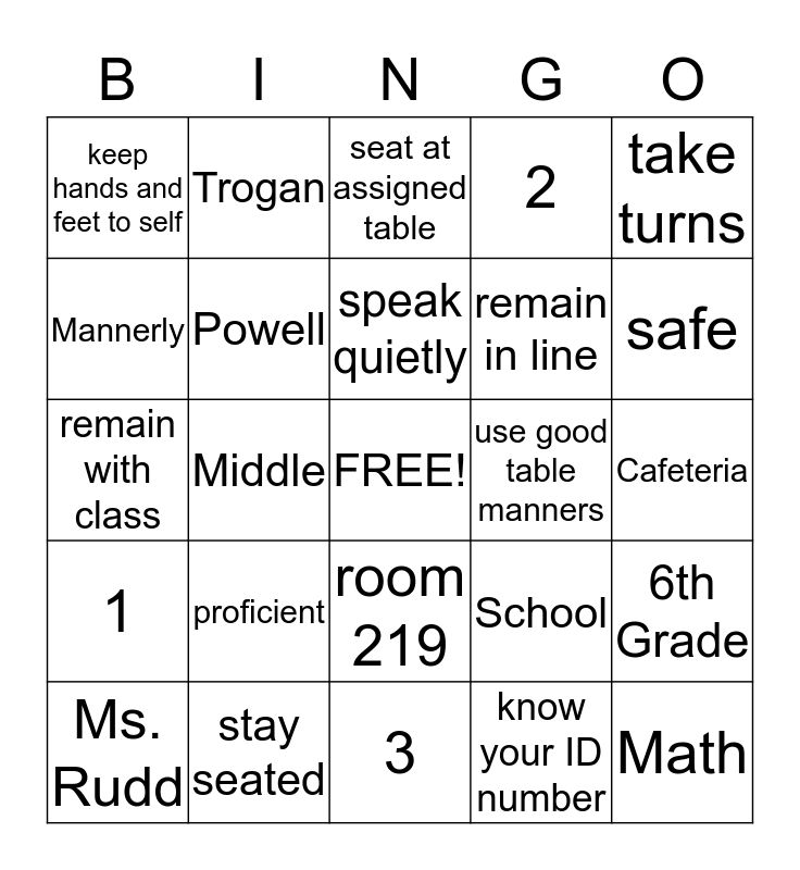 This bingo card has a free space and 24 words: proficient, stay seated, speak quietly, Ms. Rudd, take turns, keep hands and feet to self, Mannerly, Trogan, use good table manners, room 219, remain in line, remain with class, School, 6th Grade, Powell, know your ID number, Cafeteria, seat at assigned table, safe, Middle, Math, 1, 2 and 3.