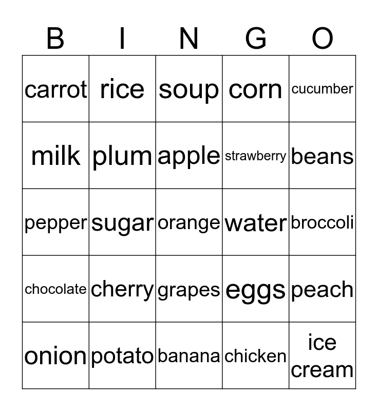 This bingo card has a free space and 24 words: cherry, potato, apple, onion, cucumber, carrot, milk, rice, water, grapes, strawberry, pepper, eggs, peach, plum, chicken, broccoli, soup, beans, sugar, ice cream, chocolate, corn and banana.