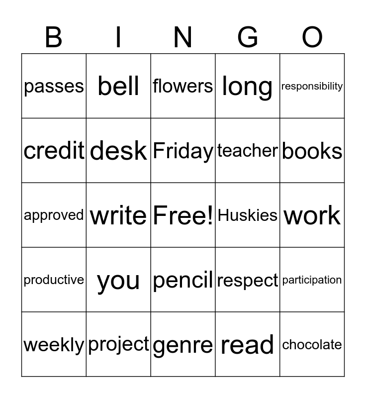 This bingo card has a free space and 26 words: pencil, read, Friday, project, responsibility, passes, credit, bell, work, respect, teacher, approved, participation, weekly, write, fluency, long, productive, flowers, chocolate, books, genre, Huskies, you, desk and principal.