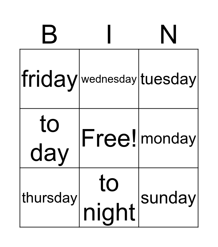 This bingo card has a free space and 8 words: monday, tuesday, wednesday, thursday, friday, sunday, to day and to night.