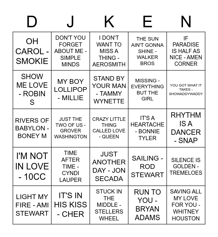 This bingo card has 45 words: ANGELS - ROBBIE WILLIAMS, CRAZY LITTLE THING CALLED LOVE - QUEEN, GOOD LIFE - INNER CITY, LIGHT MY FIRE - AMI STEWART, ANGELEYES - ABBA, RUN TO YOU - BRYAN ADAMS, I DON'T WANT TO MISS A THING - AEROSMITH, I'M OUTTA LOVE - ANASTACIA, IF PARADISE IS HALF AS NICE - AMEN CORNER, IT'S IN HIS KISS - CHER, THE SUN AIN'T GONNA SHINE - WALKER BROS, IT'S A HEARTACHE - BONNIE TYLER, JUST ANOTHER DAY - JON SECADA, TIME AFTER TIME - CYNDI LAUPER, DON'T STAND SO CLOSE TO ME - POLICE, STUCK IN THE MIDDLE - STELLERS WHEEL, WAITING FOR A GIRL - FORIGNER, RIVERS OF BABYLON - BONEY M, I HEARD IT THROUGH THE GRAPEVINE - MARVIN GAYE, YOU GOT WHAT IT TAKES - SHOWADDYWADDY, DON'T YOU FORGET ABOUT ME - SIMPLE MINDS, COMING AROUND AGAIN - CARLY SIMON, 50 WAYS TO LEAVE YOUR LOVER - PAUL SIMON, OH CAROL - SMOKIE, NEEDLES AND PINS - SMOKIE, RHYTHM IS A DANCER - SNAP, SWEETNESS - MICHELLE GAYLE, STREETS OF PHILADELPHIA - BRUCE SPRINGSTEEN, SAILING - ROD STEWART, I'M NOT IN LOVE - 10CC, WAITING FOR AN ALIBI - THIN LIZZY, SILENCE IS GOLDEN - TREMELOES, MAN, I FEEL LIKE A WOMAN - SHANIA TWAIN, ONE IN TEN - UB40, HEARTBREAKER - DIONNE WARWICK, JUST THE TWO OF US - GROVER WASHINGTON, FREE - DENISE WILLIAMS, PART TIME LOVER - STEVIE WONDER, SAVING ALL MY LOVE FOR YOU - WHITNEY HOUSTON, STAND BY YOUR MAN - TAMMY WYNETTE, SHOW ME LOVE - ROBIN S, MISSING - EVERYTHING BUT THE GIRL, SUPERSTAR - LUV INC, MY BOY LOLLIPOP - MILLIE and MYSTERIOUS WAYS - U2.