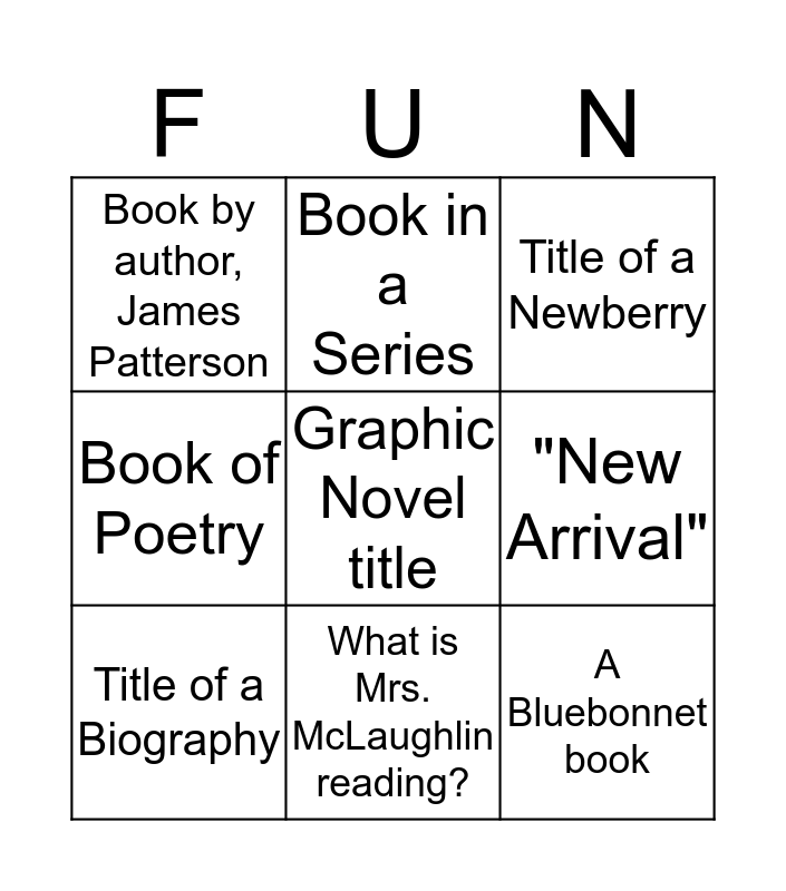 This bingo card has 9 words: Title of a Biography, Title of a Newberry, Book in a Series, Book of Poetry, Book by author, James Patterson, "New Arrival", Graphic Novel title, A Bluebonnet book and What is Mrs. McLaughlin reading?.