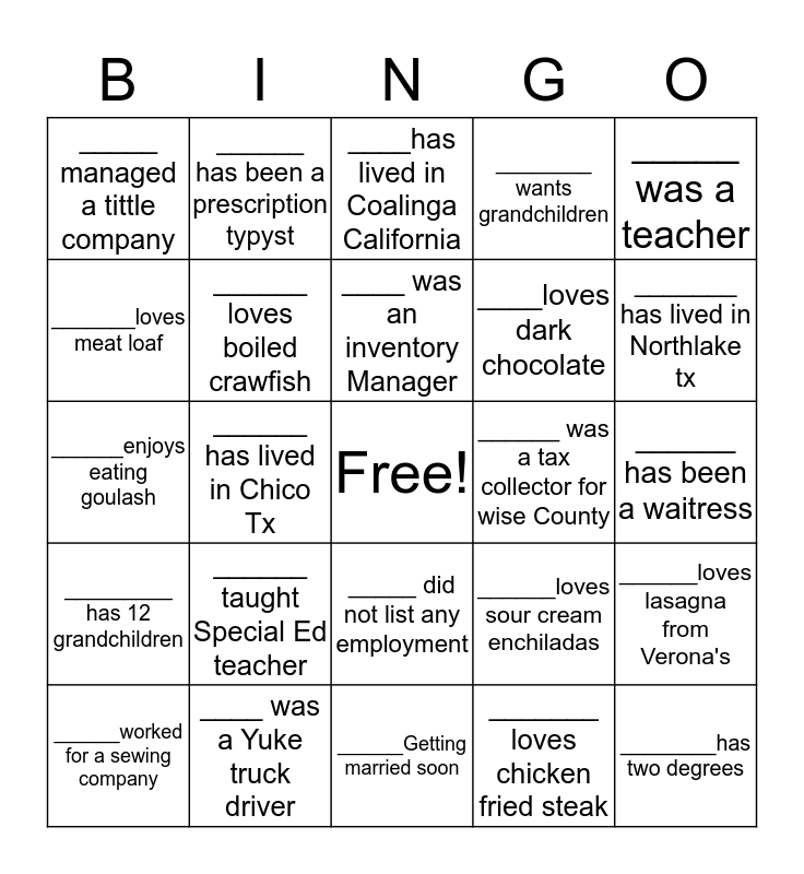 This bingo card has a free space and 24 words: ______ taught Special Ed teacher, ____ was a Yuke truck driver, ____ was an inventory Manager, ______worked for a sewing company, _____ was a teacher, _____ managed a tittle company, _______loves meat loaf, ______ has been a prescription typyst, ______ was a tax collector for wise County, _____ did not list any employment, ____loves dark chocolate, ______enjoys eating goulash, ______loves sour cream enchiladas, ______loves lasagna from Verona's, ______ loves boiled crawfish, _______ loves chicken fried steak, ______ has been a waitress, ____has lived in Coalinga California, _______ has lived in Northlake tx, ______ has lived in Chico Tx, ________has two degrees, _________ has 12 grandchildren, ________ wants grandchildren and ______Getting married soon.