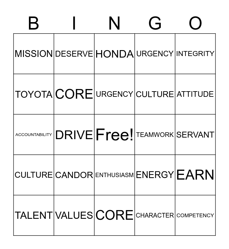 This bingo card has a free space and 24 words: CANDOR, VALUES, URGENCY, TALENT, INTEGRITY, MISSION, TOYOTA, DESERVE, TEAMWORK, ENTHUSIASM, CULTURE, ACCOUNTABILITY, ENERGY, EARN, CORE, CHARACTER, SERVANT, HONDA, ATTITUDE, DRIVE, COMPETENCY, CULTURE, URGENCY and CORE.