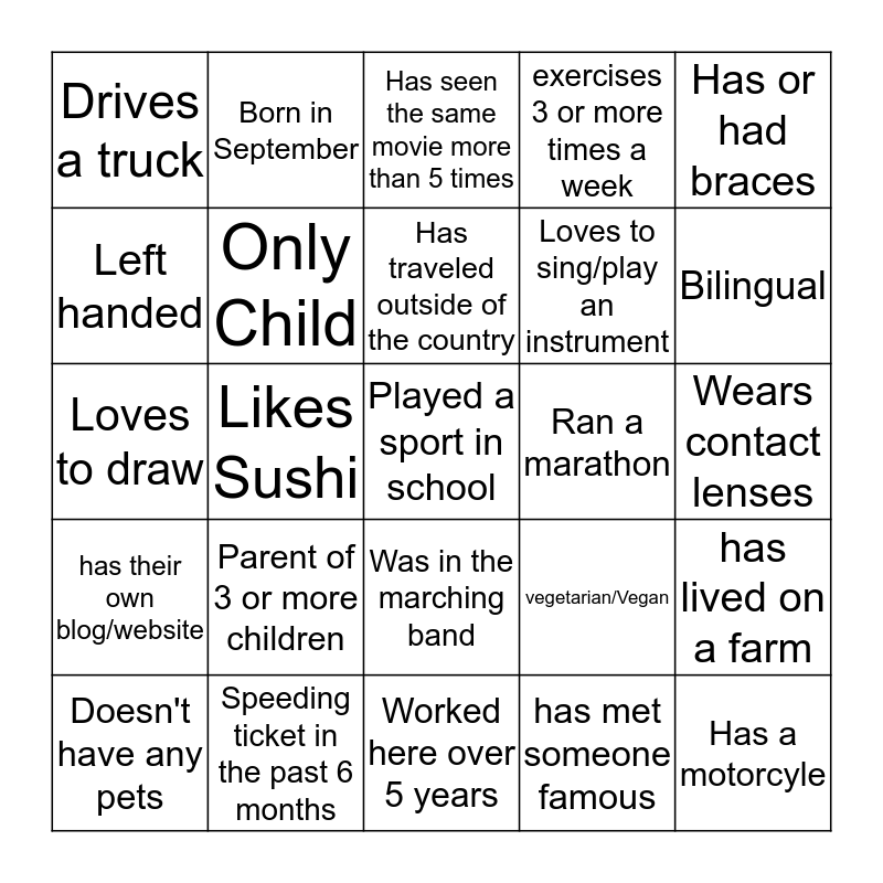 This bingo card has 25 words: Parent of 3 or more children, Worked here over 5 years, Has traveled outside of the country, Doesn't have any pets, Has or had braces, Drives a truck, Left handed, Born in September, Ran a marathon, Was in the marching band, Loves to sing/play an instrument, Loves to draw, vegetarian/Vegan, has lived on a farm, Only Child, Has a motorcyle, Wears contact lenses, Has seen the same movie more than 5 times, Bilingual, Likes Sushi, Played a sport in school, Speeding ticket in the past 6 months, has their own blog/website, exercises 3 or more times a week and has met someone famous.