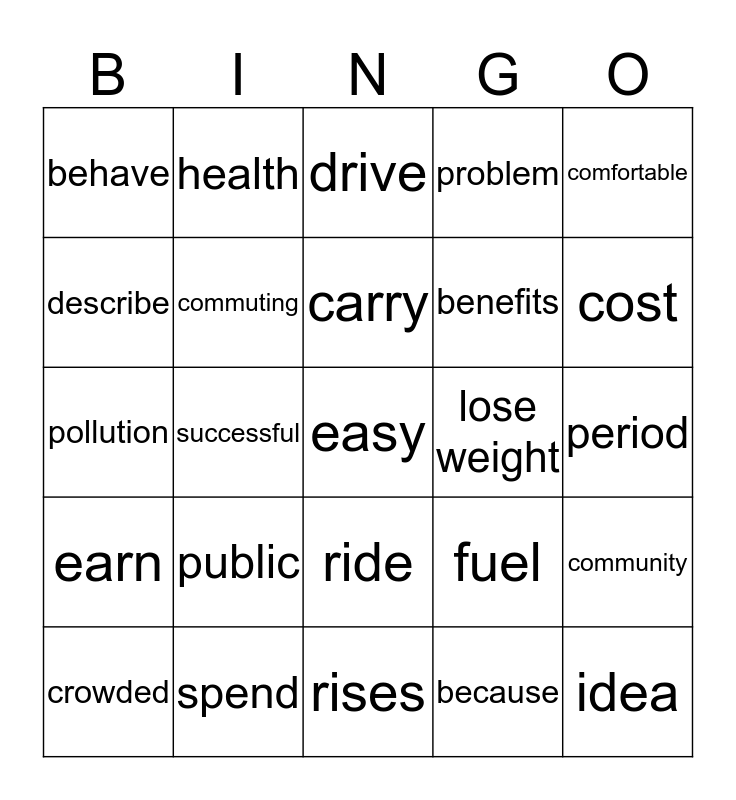 This bingo card has 25 words: public, rises, carry, crowded, comfortable, behave, describe, health, lose weight, ride, benefits, pollution, fuel, community, commuting, idea, period, drive, cost, successful, easy, spend, earn, problem and because.