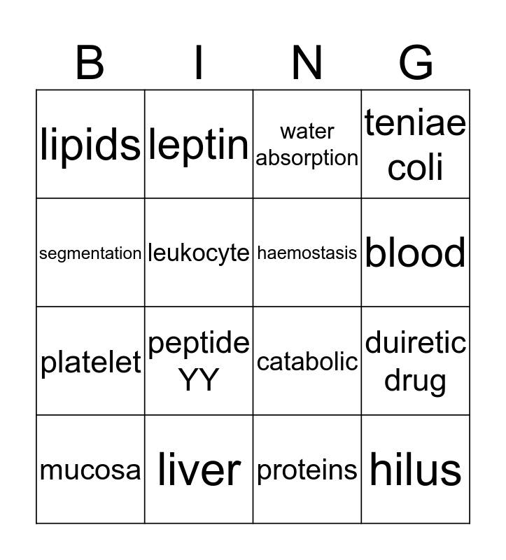 This bingo card has 45 words: Free!, mucosa, muscularis layer, chief cells, stomach, nutrient absorption, water absorption, peristalsis, segmentation, mucous, teniae coli, liver, gallbladder, hepatic artery, pancreas, jaundice, duodenum, catabolic, ghrelin, peptide YY, leptin, disaccharide, monosaccharide, lipids, LDL, proteins, erythropoeitin, calcitriol, fat and ribs, hilus, nephron, tubule, curpuscle, large surface area, proximal (PCT), duiretic drug, transitional, kidney stones, micturition, blood, leukocyte, platelet, haemoglobin, haemostasis and haematopoeisis.