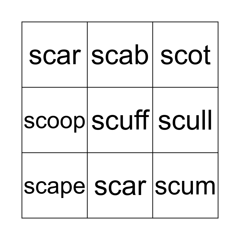 This bingo card has 9 words: scape, scot, scab, scoop, scar, scull, scuff, scum and scar.