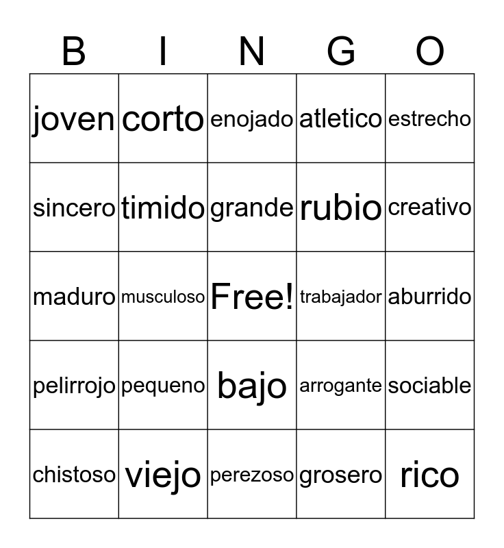 This bingo card has a free space and 24 words: pequeno, viejo, grande, chistoso, estrecho, joven, sincero, corto, trabajador, bajo, rubio, maduro, arrogante, sociable, timido, grosero, aburrido, enojado, creativo, musculoso, rico, pelirrojo, atletico and perezoso.